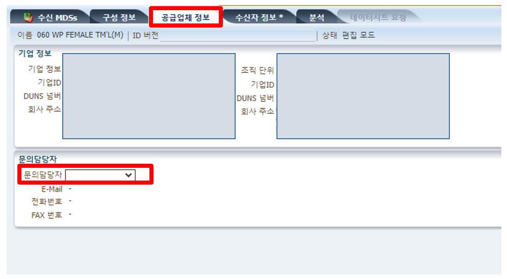 8. 공급업체 정보 탭에서 회사 문의담당자 정보 클릭
