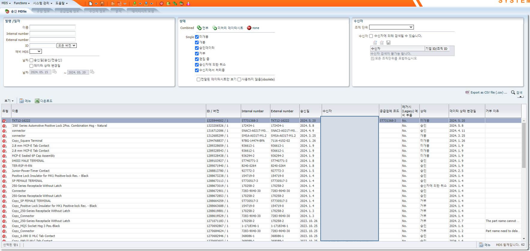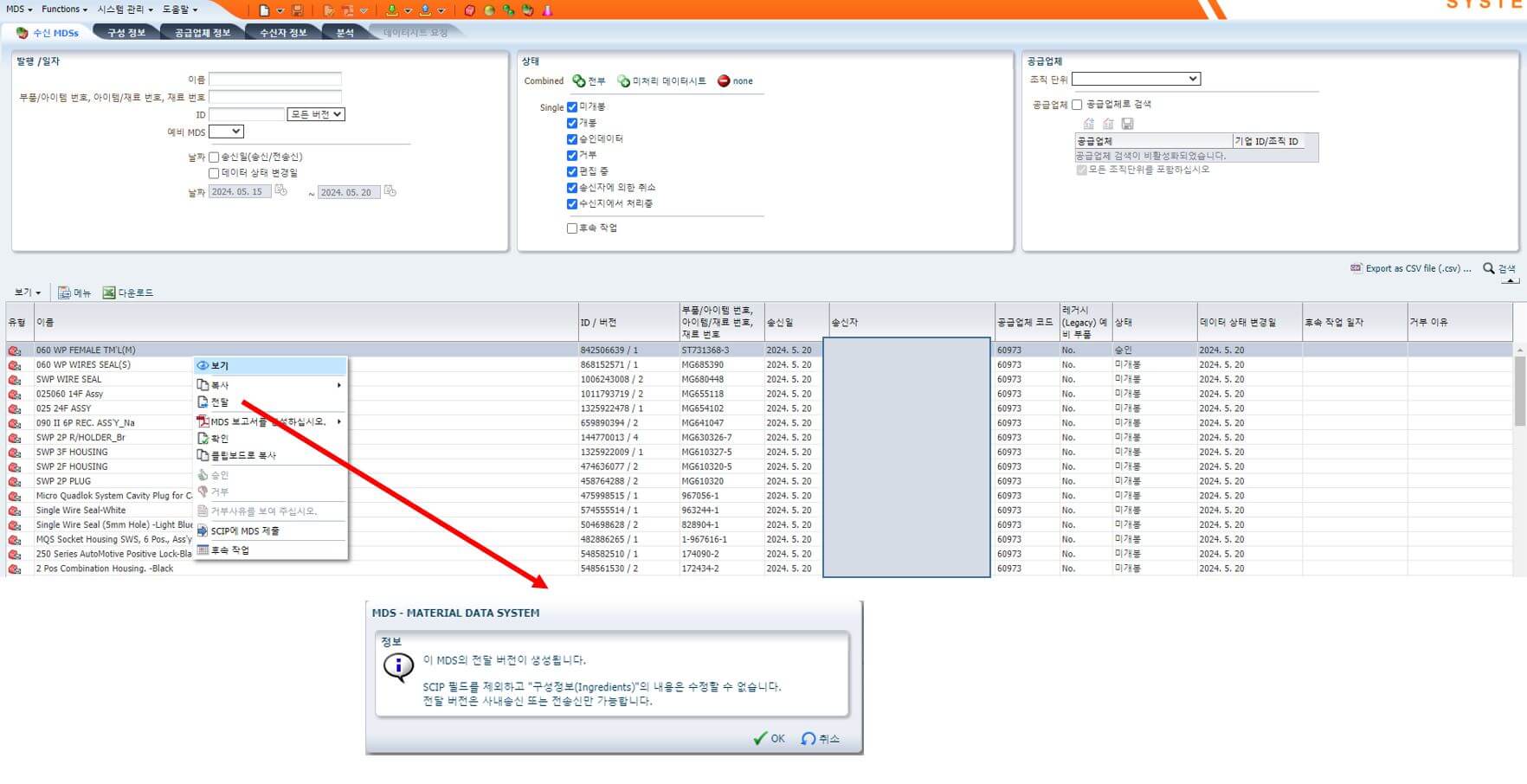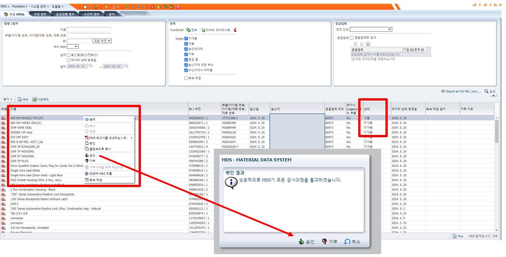 5. 자료에 이상이 없으면 "수신 MDSs" 탭으로 가서 방금 개봉했던 파일을 마우스 우클릭한 후 "승인"버튼을 누르면 자료의 상태가 '승인'으로 바뀌면서 정상적인 수신이 완료됩니다.