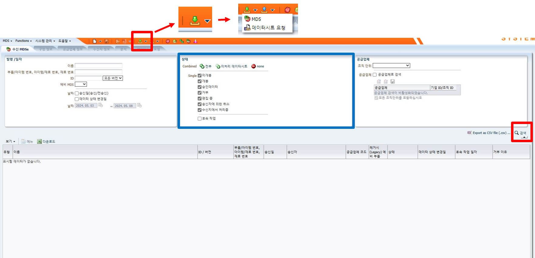 2. 수신함을 클릭한 뒤, MDS를 클릭해주세요. 그리고 나서 오른쪽 중간에 있는 "검색" 버튼을 눌러주세요.