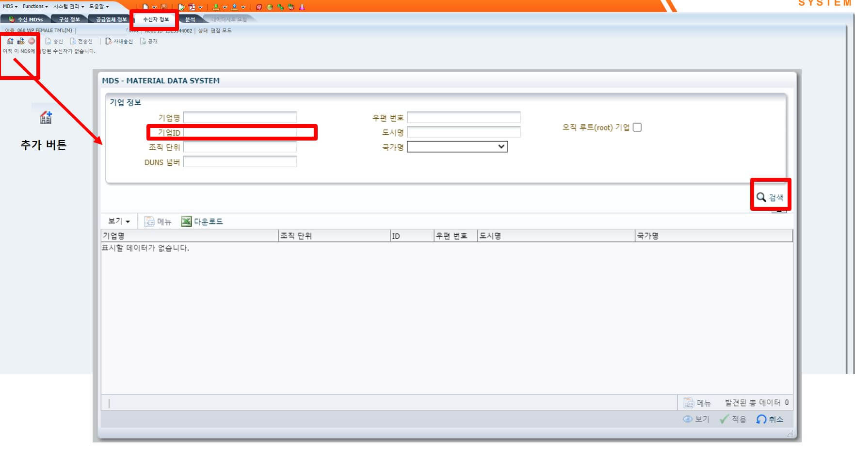 9. 수신자정보 탭에서 추가버튼 클릭 후 송부하려는 상대방 업체 기업 ID 로 검색 후 적용