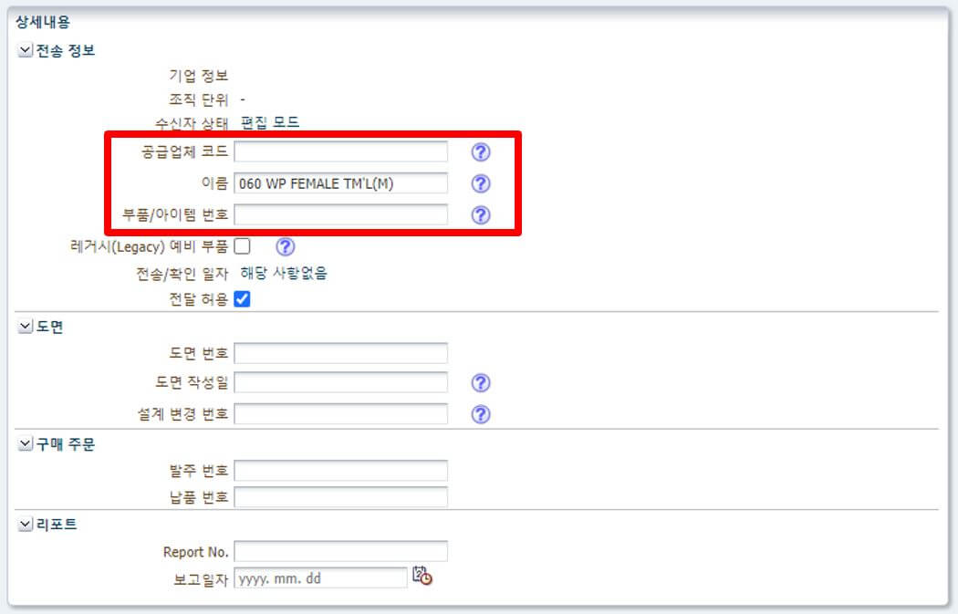 10. 상세내용에 공급업체 코드, 이름, 부품/아이템 번호 수정 가능